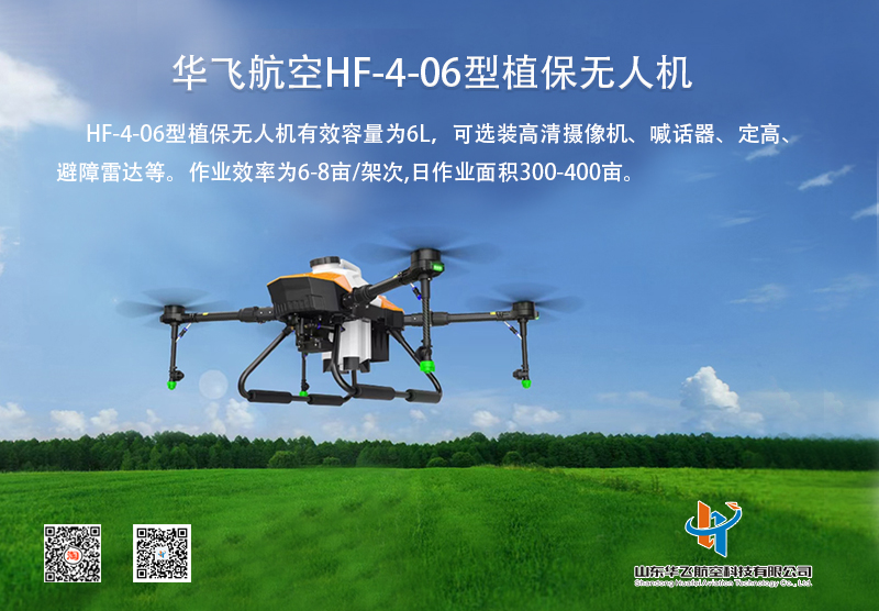 山東華飛航空科技全新推出HF-4-06型無人機,該機型植保無人機是專門針對丘陵山區、園林、小面積種植園區輕量級作業需求設計的一款小型多用途植保無人機。藥箱有效容量為6L,每小時可植保作業50畝左右,機身輕便可折疊、易攜帶,功能強大且具有二次開發應用優勢。