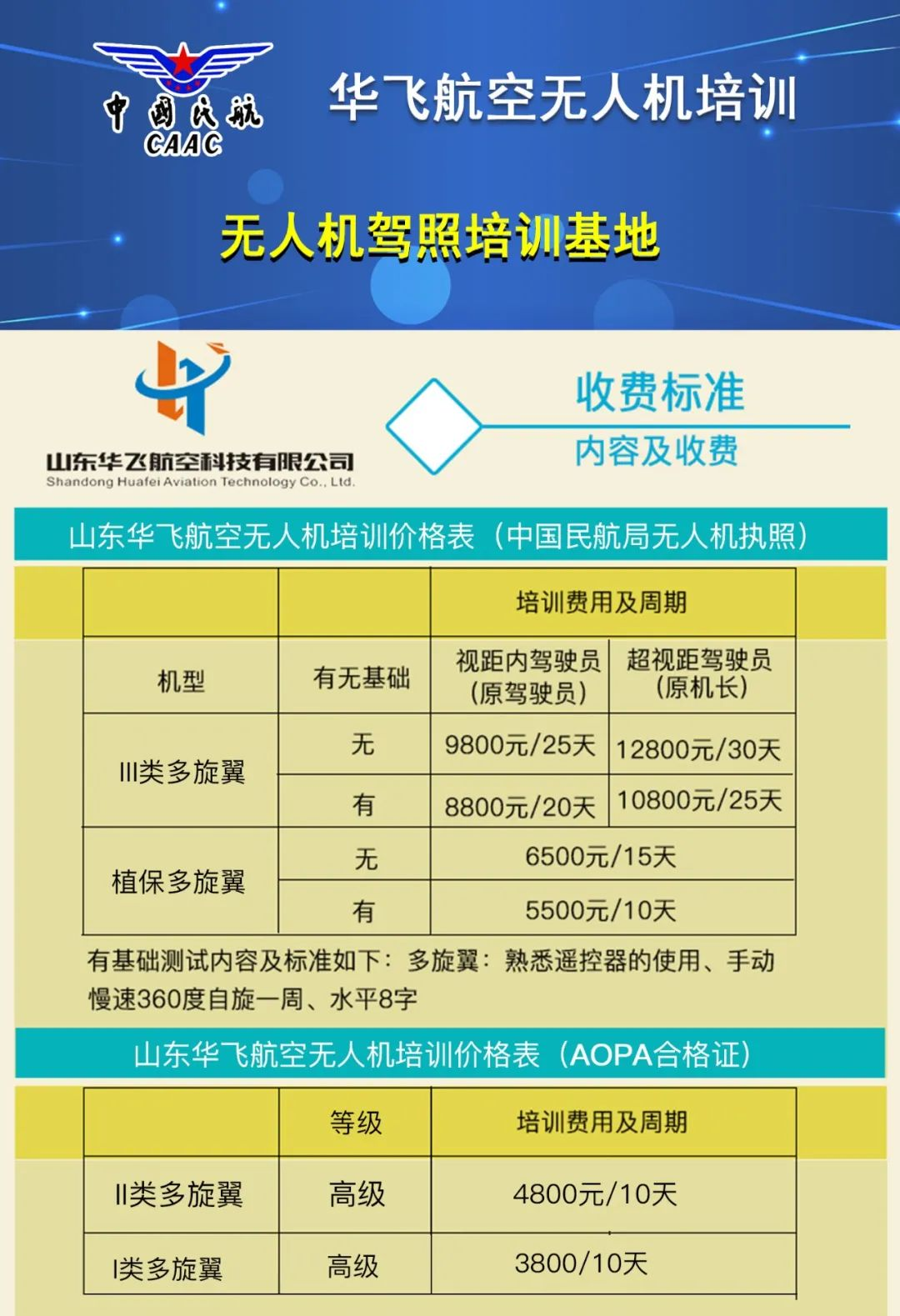 2、為回饋廣大無人機愛好者幾年來對山東華飛航空科技的支持與厚愛,首期參加AOPA合格證報名培訓的學員均可享受現價基礎上的7折優惠價(收費標準見圖表。優惠活動限首期報名學員)。