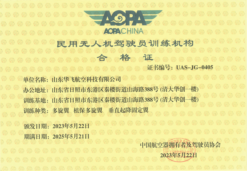 山東華飛航空科技有限公司(簡(jiǎn)稱華飛航空)位于美麗的海濱城市—日照大學(xué)科技園區(qū)。企業(yè)注冊(cè)資金300萬(wàn)元。華飛航空是經(jīng)中國(guó)航空器擁有者及駕駛員協(xié)會(huì)(AOPA)審定合格的無(wú)人機(jī)培訓(xùn)機(jī)構(gòu)。擁有中國(guó)民航局多旋翼無(wú)人機(jī)視距內(nèi)操控員、超視距操控員、垂直起降固定翼超視距操控員、植保機(jī)無(wú)人機(jī)操控員駕駛執(zhí)照和 AOPA 民用無(wú)人機(jī)Ⅰ類、Ⅱ類、Ⅲ類、Ⅴ類植保操控員合格證培訓(xùn)資質(zhì)。是山東省日照市退役軍人事務(wù)局審核、批準(zhǔn)的退役士兵無(wú)人機(jī)職業(yè)技能技術(shù)培訓(xùn)定點(diǎn)培訓(xùn)機(jī)構(gòu)。